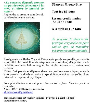 Pratiquant le yoga en autodidacte jusqu'alors, j'ai découvert cette année les cours d'Aline. une véritable révélation; Aline est très à l'écoute et d'une grande bienveillance, elle adapte la pratique à chacun selon ses possibilités et on ressent un bien-être immédiat et durable à la sortie du cours. L'impression de flotter sur un nuage, une lérèreté retrouvée. A tester de toute urgence.