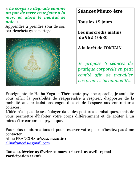 Pour plus de détails sur les cours, et le hatha yoga, je vous propose de rejoindre la page Yoga en haut de l'écran.
